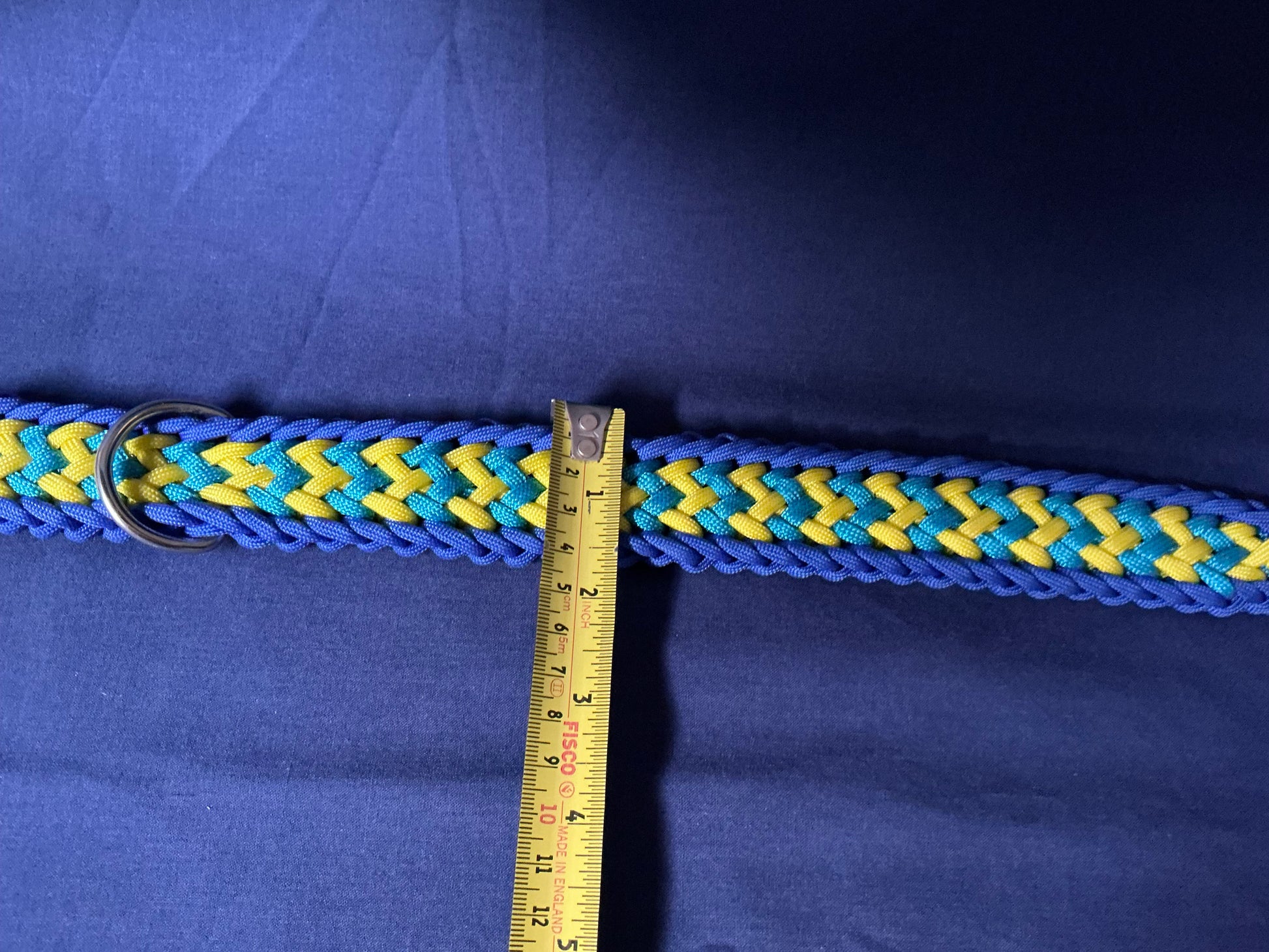 1.4” Wide 17” Long Light and Dark Blue, with Yellow Braided None Adjustable Paracord Dog Collar