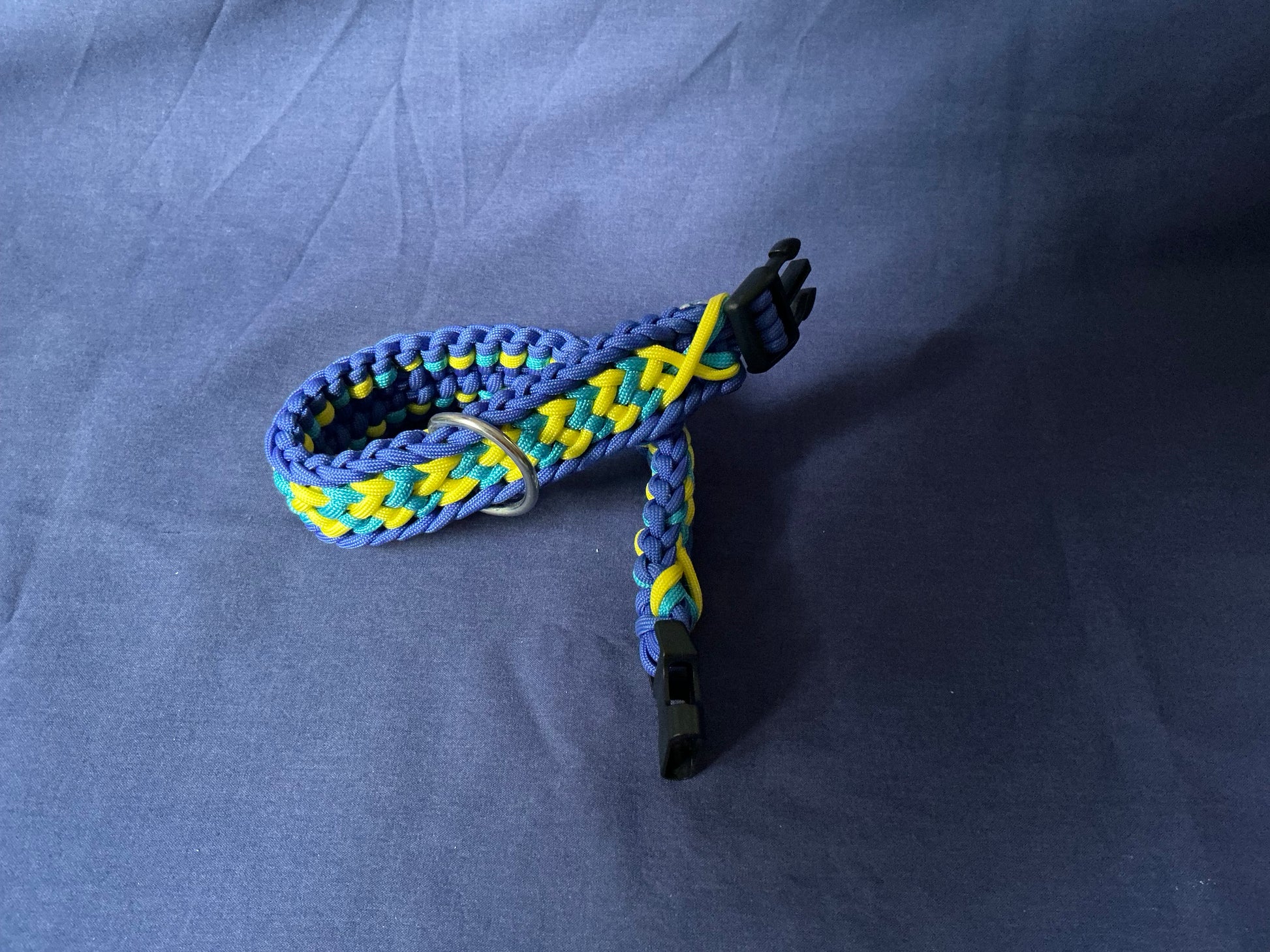 This handcrafted dog collar is made from high-quality paracord in a bright combination of light and dark blue, and yellow. The tight braided pattern provides excellent strength while keeping the collar lightweight, flexible, and comfortable for pets. Equipped with a sturdy plastic buckle and a stainless steel D-ring, this collar is easy to fasten and perfect for attaching leads, tags, or training accessories.