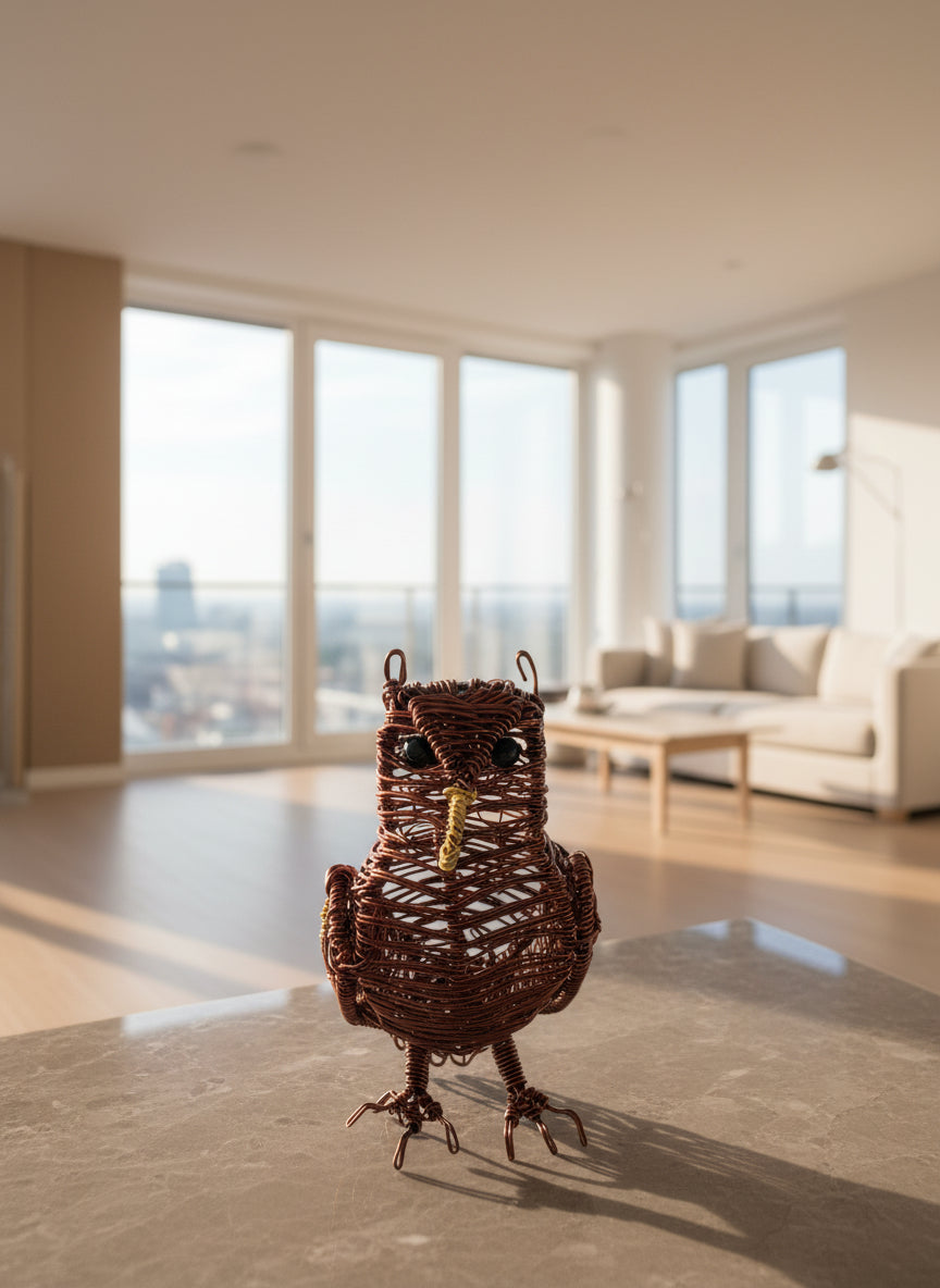 The sculpture features carefully shaped wings, expressive eyes, and delicate wire feet, giving it personality and depth. Displayed on a wooden stand or shelf, it adds warmth and artistic presence to modern interiors, offices, reading corners, or minimalist spaces.