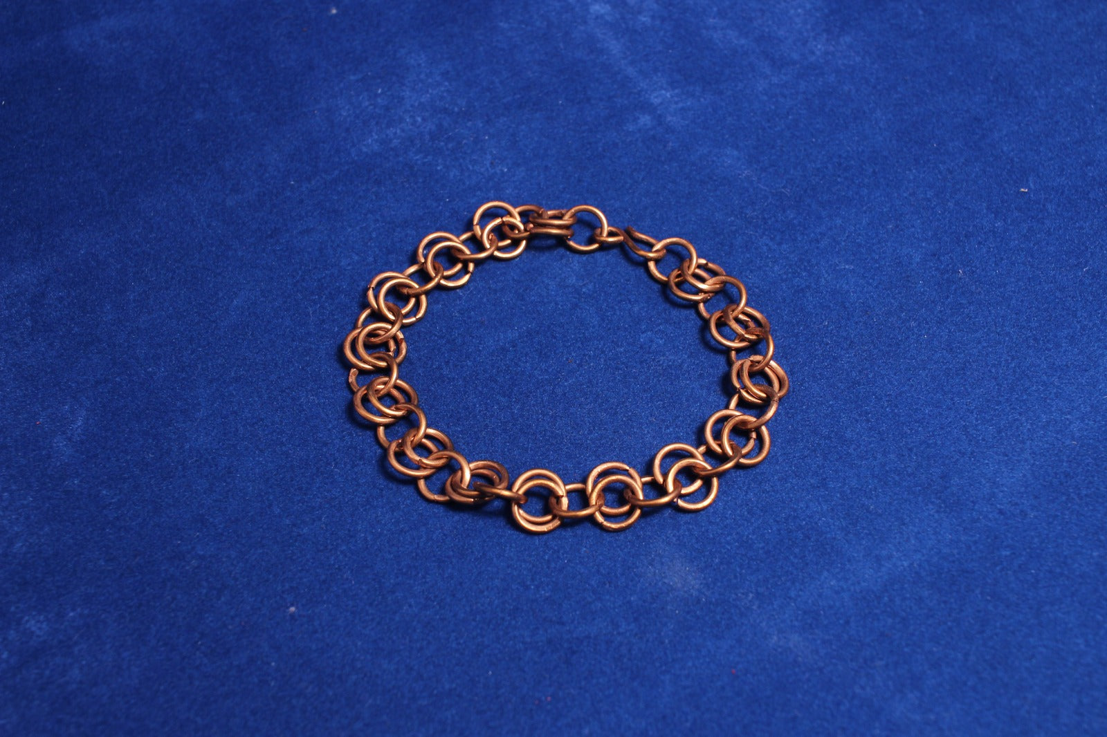 Copper has been worked by artisans for thousands of years, prized for its malleability and warm glow. This bracelet is crafted using traditional jump ring techniques, where patience and precision transform simple metal rings into an intricate chain. Each connection is a small act of creation, building rhythm and pattern through repetition until the piece comes alive as a unified whole—a testament to the meditative nature of handwork.