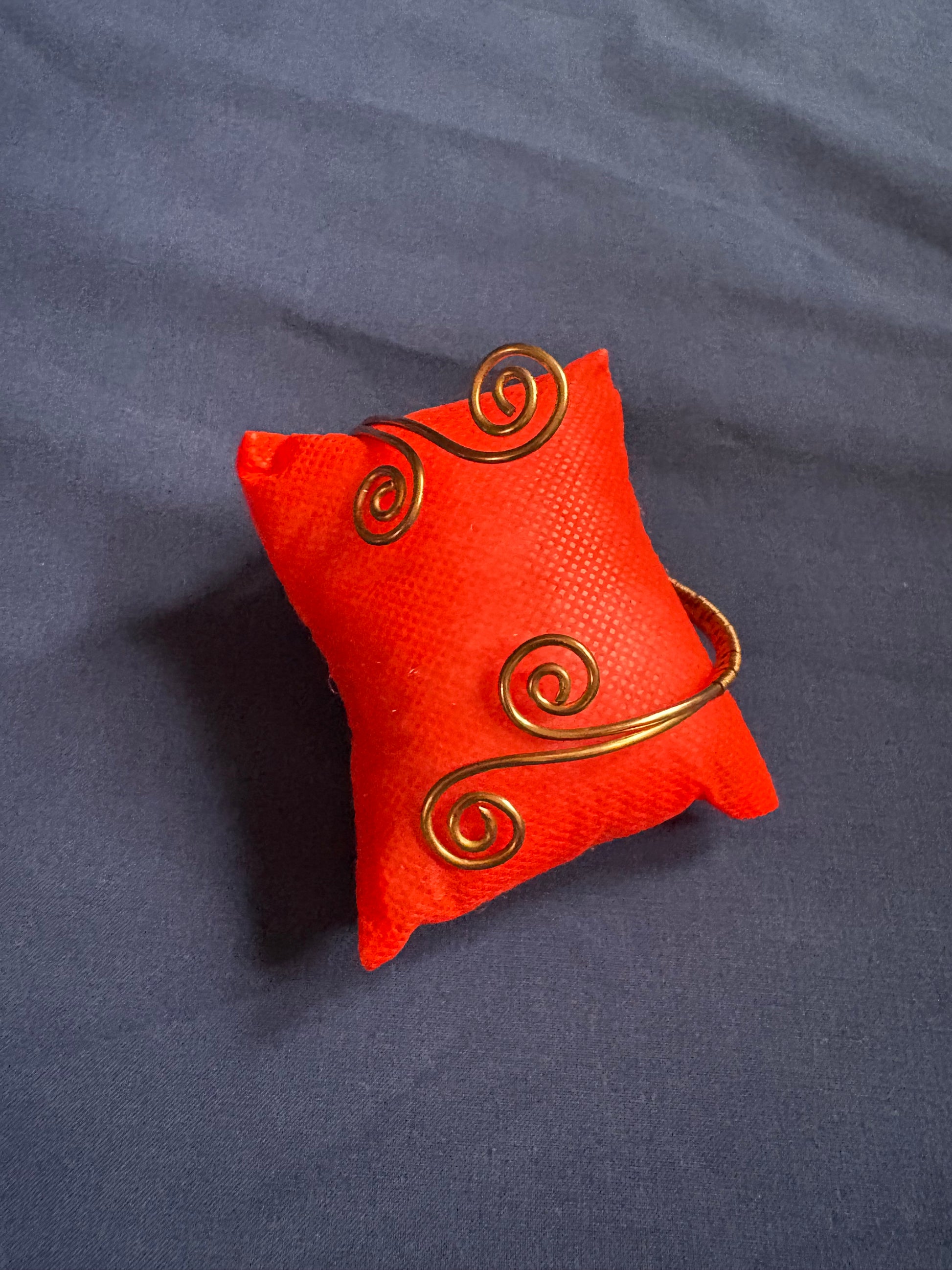 Each arm bangle begins as a single strand of copper wire, carefully measured and shaped by hand. Through patient bending and forming, the double swirl pattern emerges at each end—four spirals in total that mirror nature's own designs found in shells, ferns, and galaxies. The copper is worked whilst maintaining its natural properties, allowing it to develop a unique patina over time that tells the story of its wearer. This is wearable art, where metalwork meets meditation.