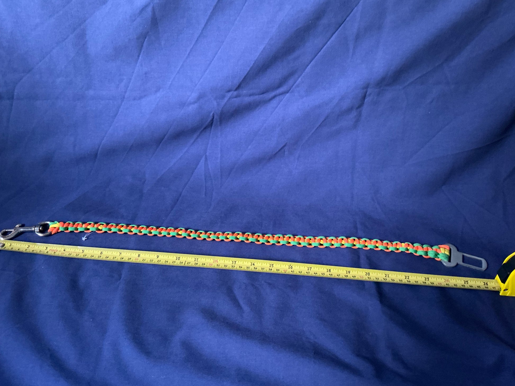 This handcrafted car safety leadis made from durable paracord in a bright green, orange, and yellow blend, braided into a strong yet flexible design. The tight, uniform weave ensures reliability while keeping the safety lead lightweight and comfortable. It features secure metal hardware along with a sturdy clip for attaching to seat belt holder.