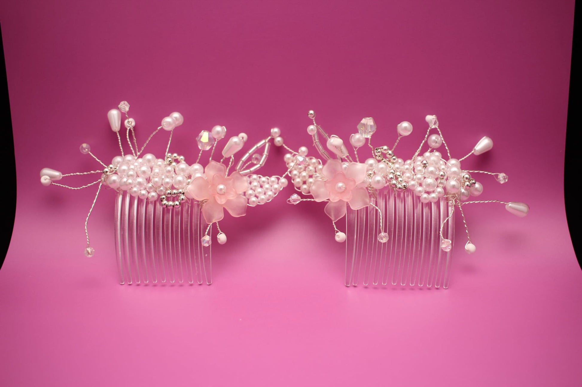 Creating each hair comb begins with selecting the finest materials – lustrous imitation pearls chosen for their beautiful sheen, delicate pink flowers that capture the essence of romance, tiny silver beads that add sparkle, and fine shiny silver wire that brings everything together. Through patient hand-wiring techniques, each element is carefully secured and positioned to create a flowing, organic design that moves naturally with your hair.