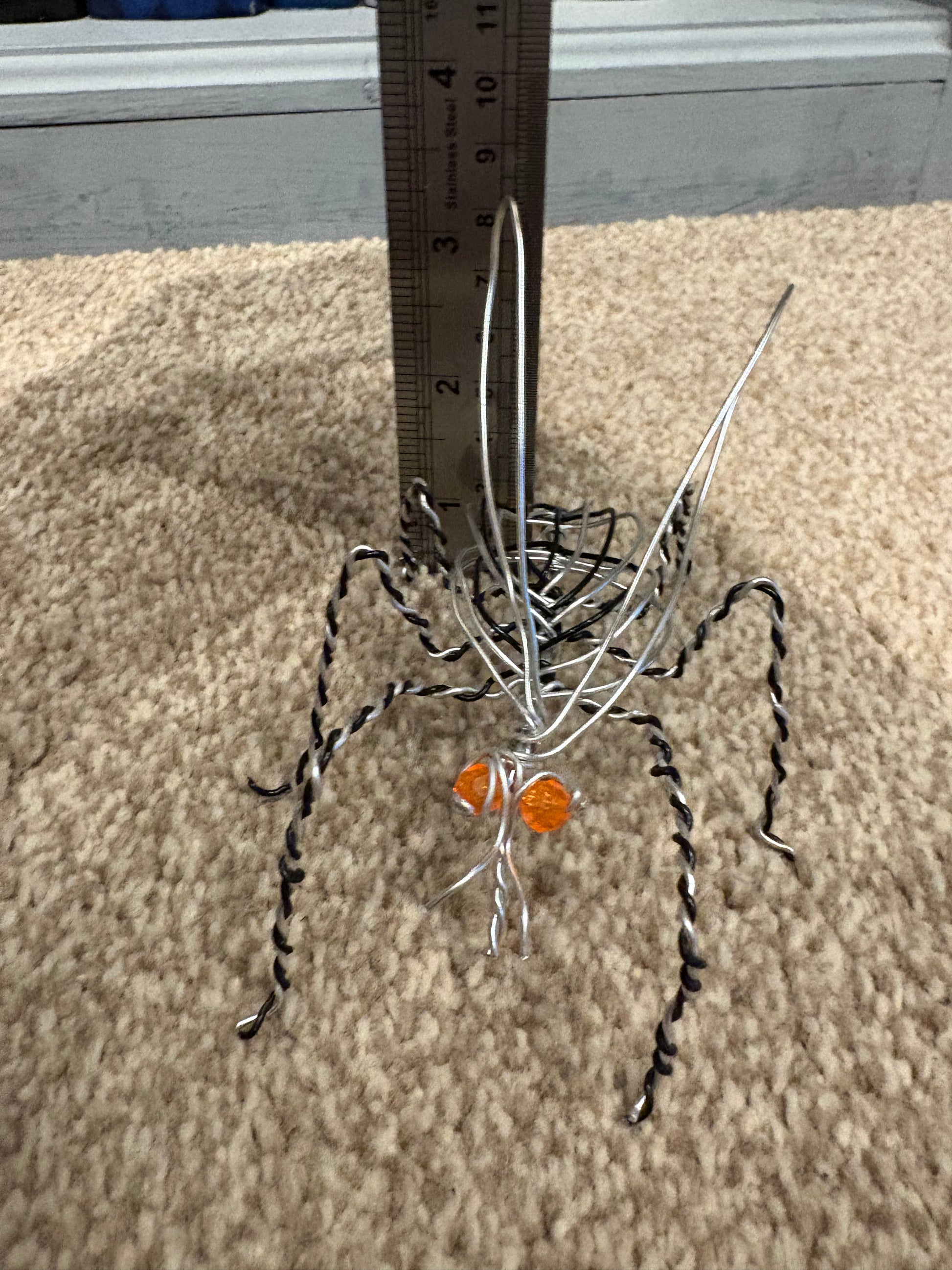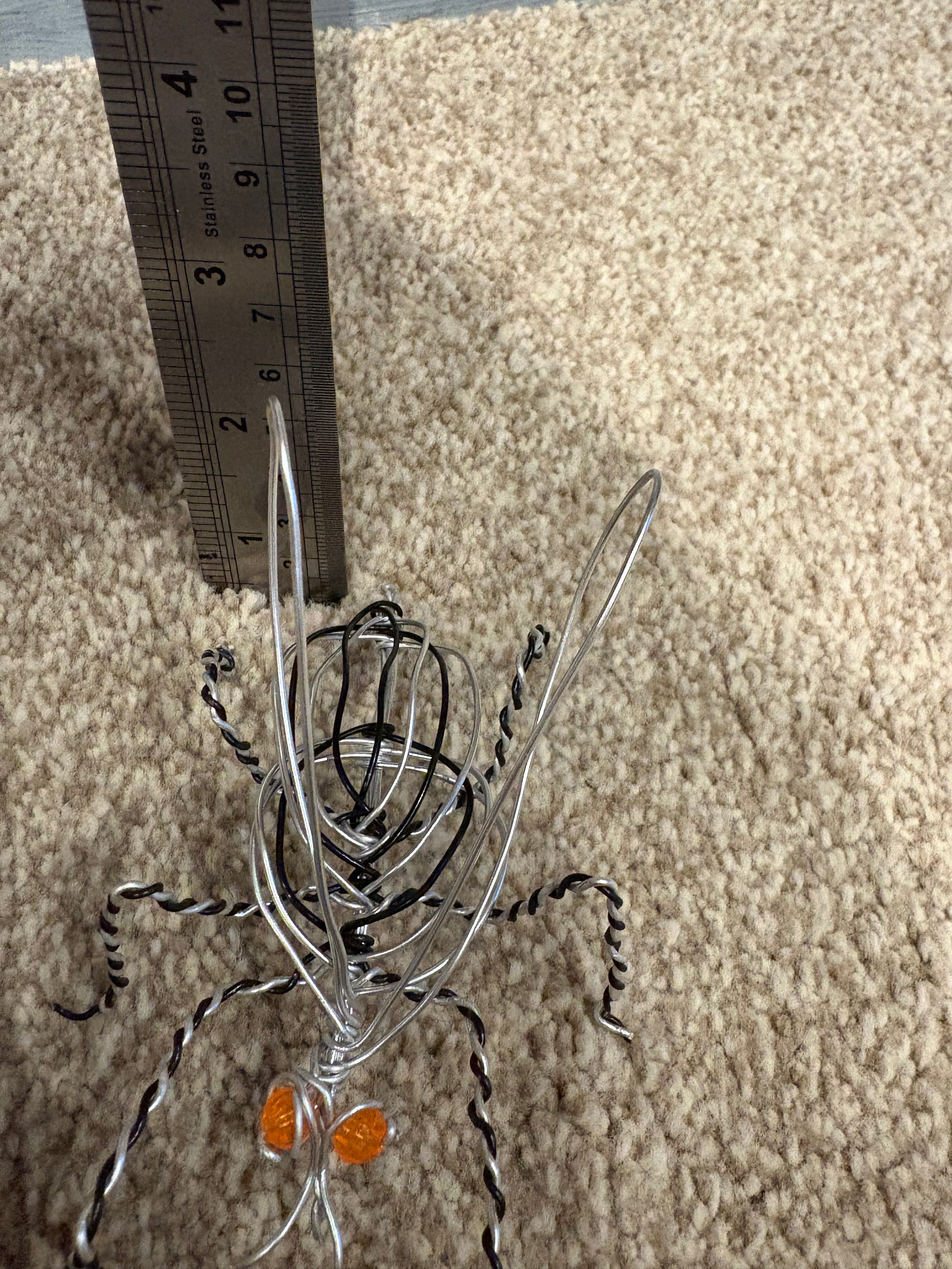 This striking handmade wire sculpture captures the delicate form of an insect using twisted silver and black wire. Each leg, wing, and curve is shaped by hand, creating a dynamic, lifelike pose that highlights the artistry behind the piece. The sculpture features two warm amber-coloured beads for eyes, adding a vivid touch of colour and personality to the design.