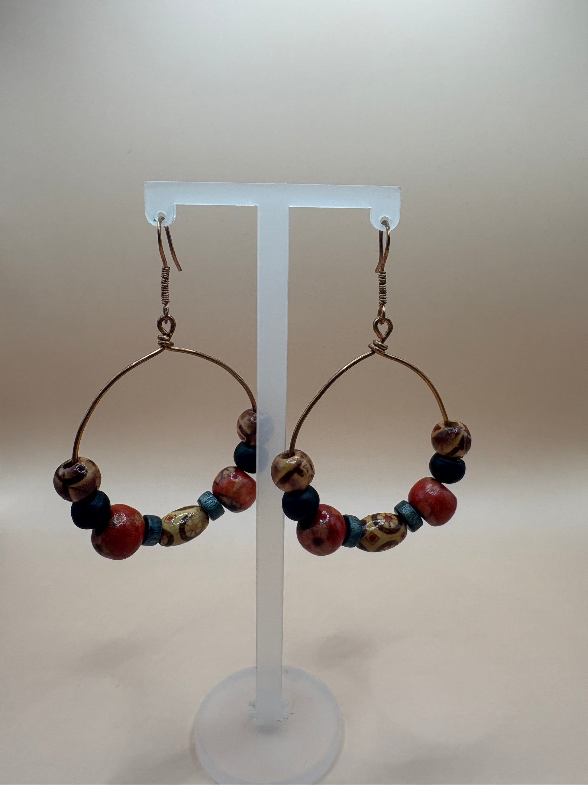 Copper Wire Earrings with Wooden Beads