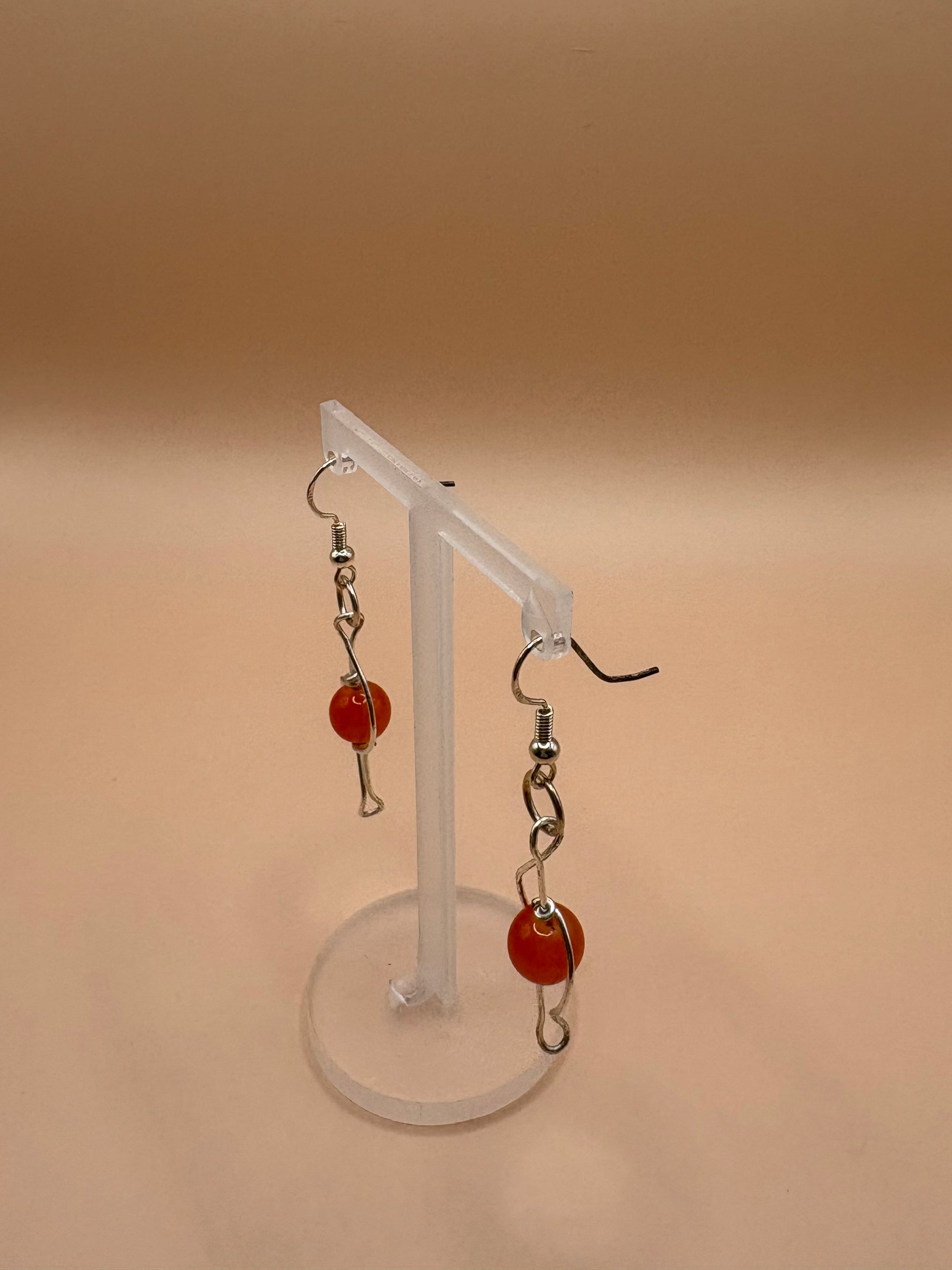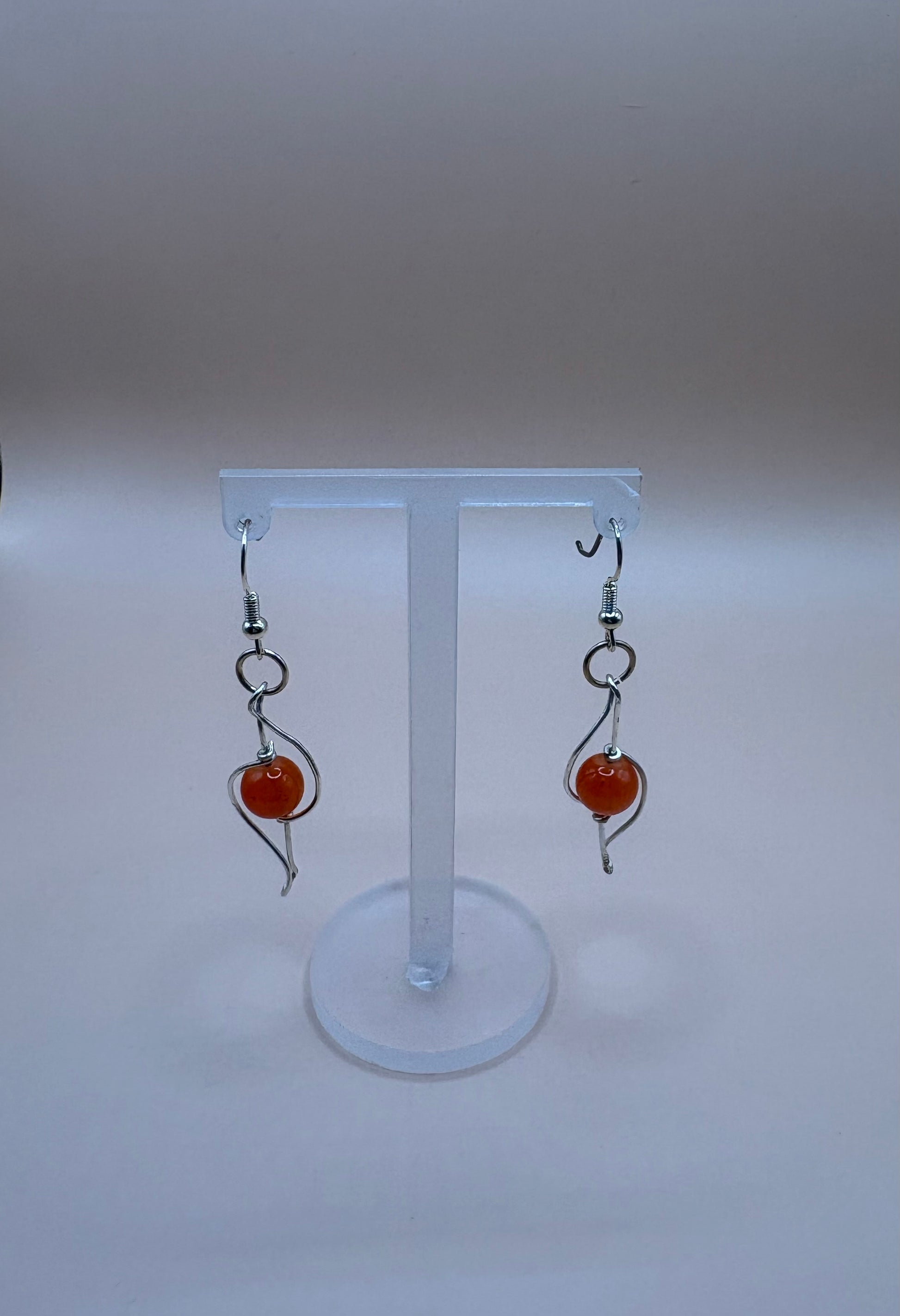 These stunning Sterling silver wire earrings from TFS Designs feature elegant curves and warm carnelian gemstones, creating a graceful and eye-catching handcrafted design. Each earring is shaped with flowing silver wire that wraps gently around the round gemstone, giving the piece a natural, fluid appearance.