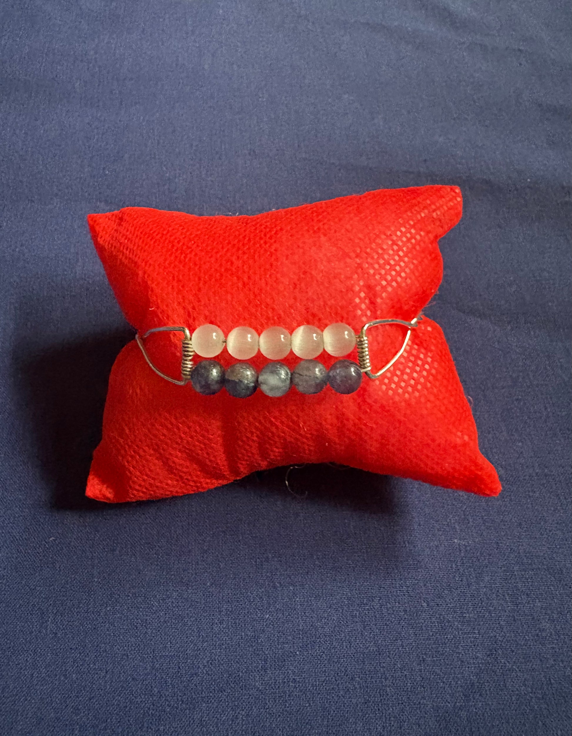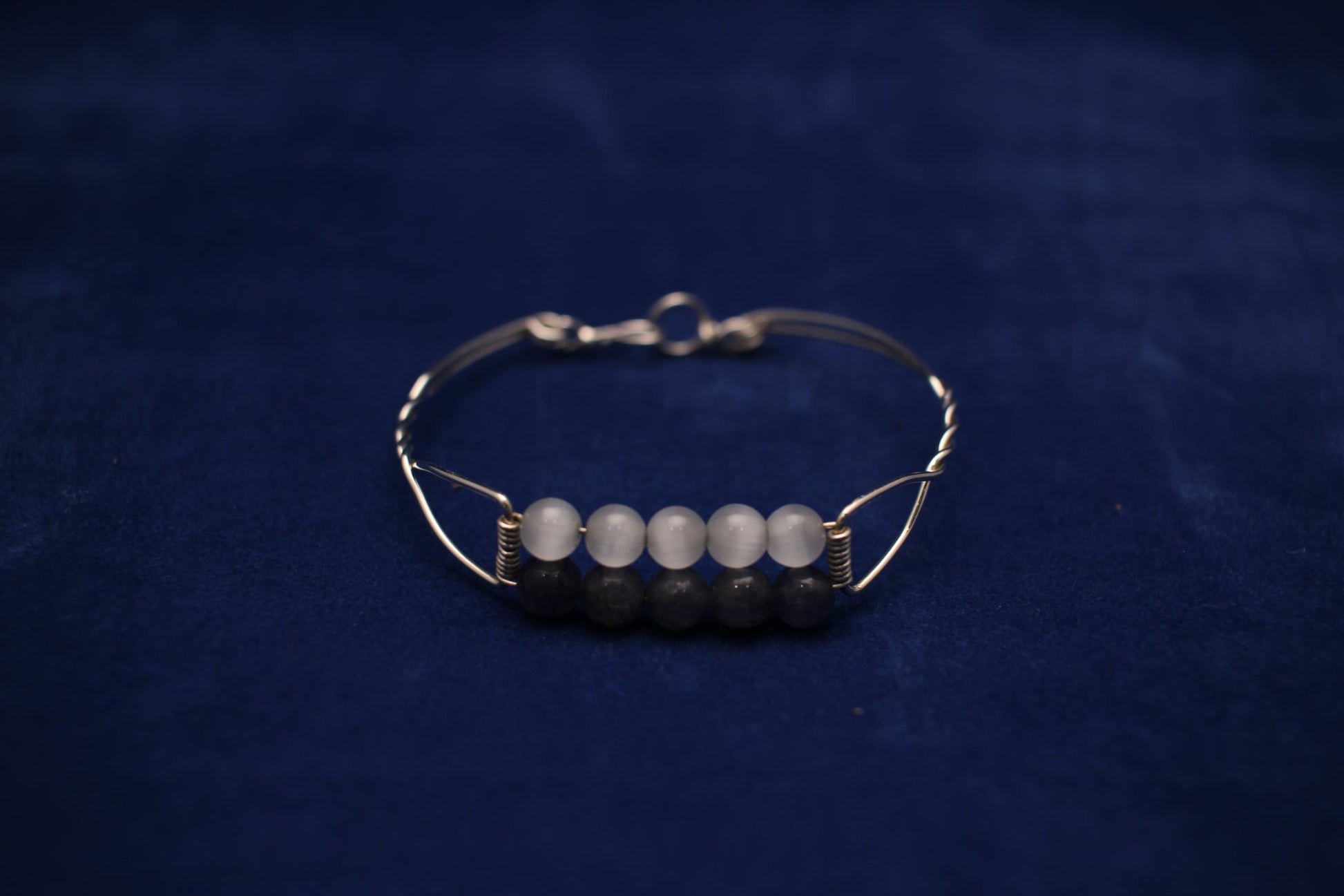 This handcrafted sterling silver bangle showcases the ancient art of wire wrapping, where each twist and curve is carefully shaped by hand. Adorned with genuine moonstone and iolite gemstones, the piece combines lustrous silver with the ethereal glow of moonstone and the deep violet-blue shimmer of iolite.