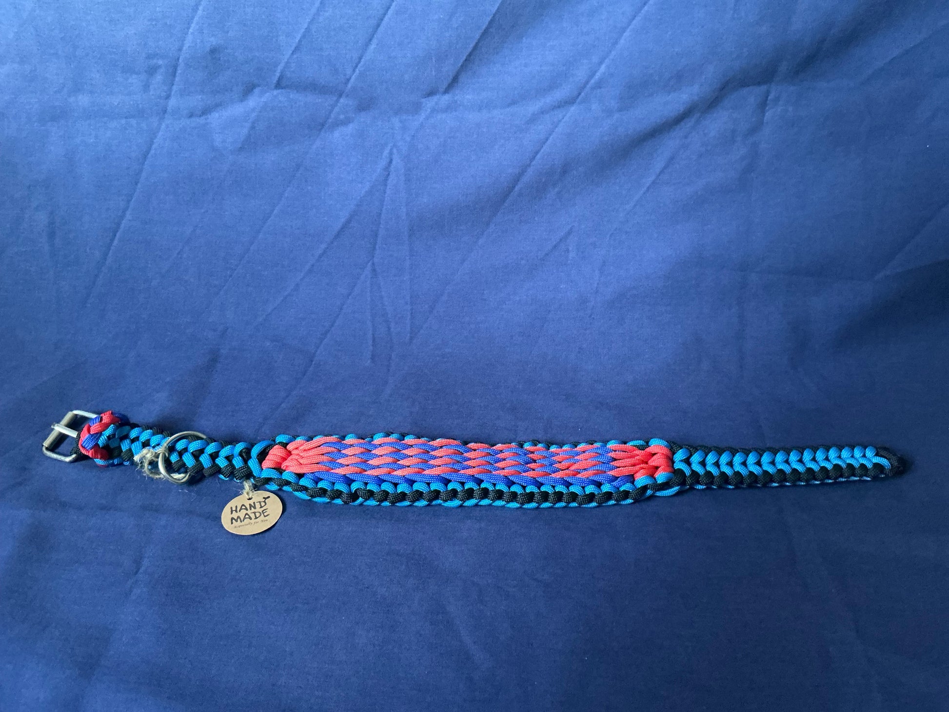 This wide handcrafted dog collar is woven from premium paracord in a bold combination of blues , red, and black. Its thick, multi-layered candy striped braid offers exceptional durability while remaining comfortable for pets, making it perfect for daily wear, training, or outdoor activities. The sturdy design ensures long-lasting strength and stability while the smooth paracord texture sits comfortably against the animal’s neck.