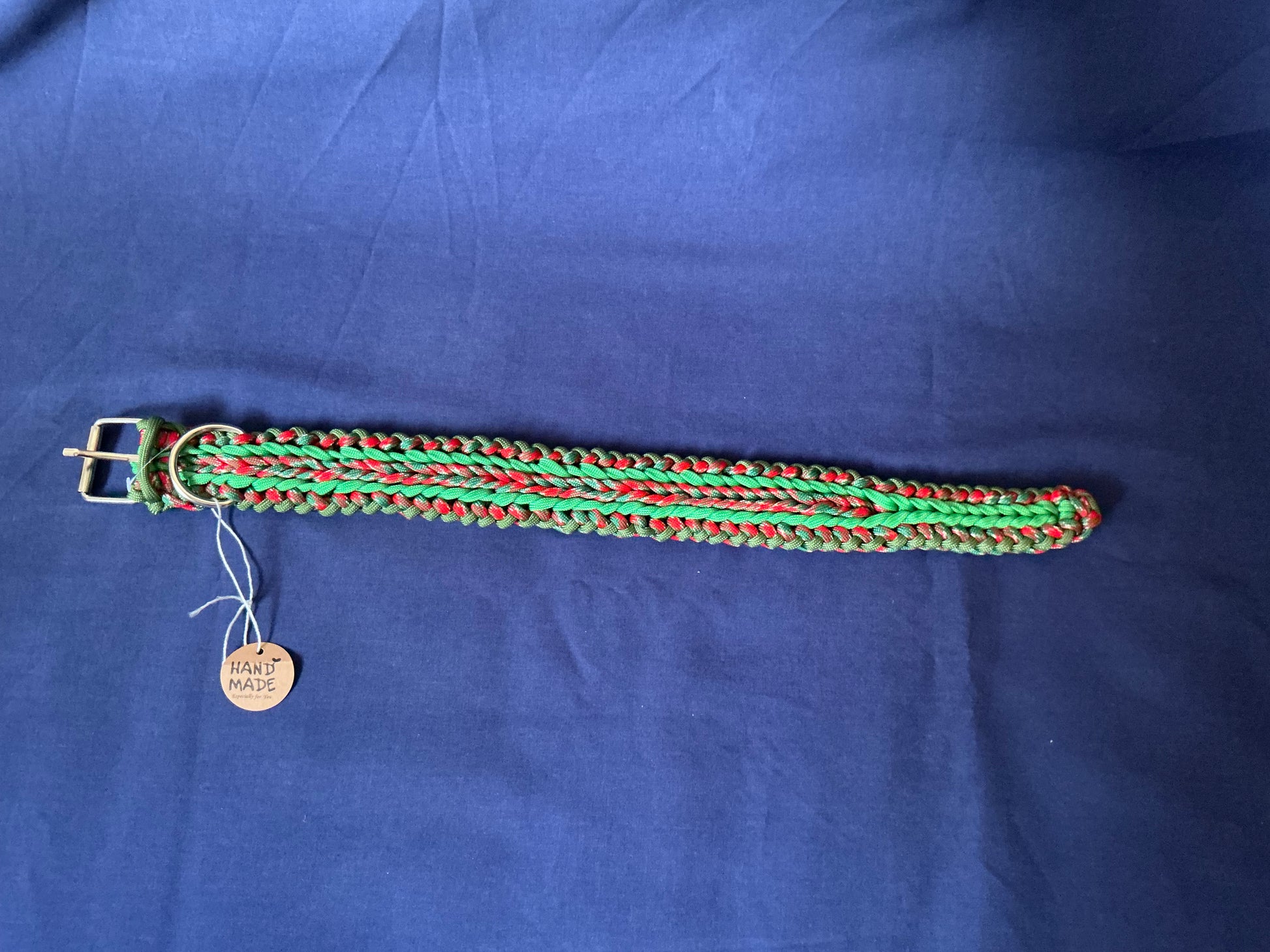 This wide handcrafted dog collar is made from multiple strands of strong paracord woven into an intricate red, green, and olive braid. The thick, flat design provides extra comfort and durability, making it ideal for pets that need a sturdy, reliable collar for daily use, training, or outdoor activities. Its layered weaving style adds strength while keeping the collar flexible and comfortable for the animal to wear.