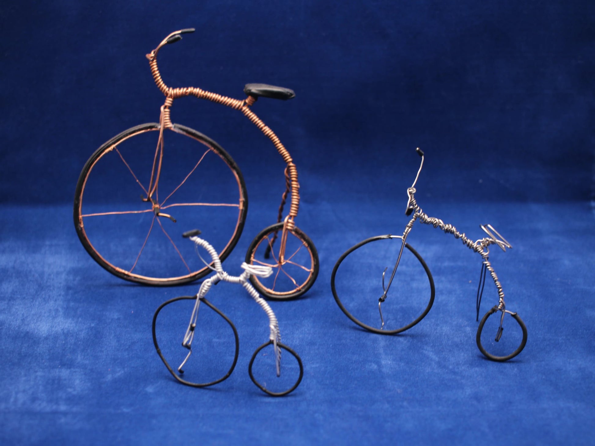 This handcrafted wire bicycle sculpture set features three beautifully shaped miniature rustic bikes, each made with elegant twists of copper, silver, and black wire. The largest bicycle carries a charming vintage look with its tall frame and curved handlebar, while the two smaller bicycles add a playful, modern contrast. Every piece is carefully hand-shaped, giving the set a sense of movement, character, and artistic expression.