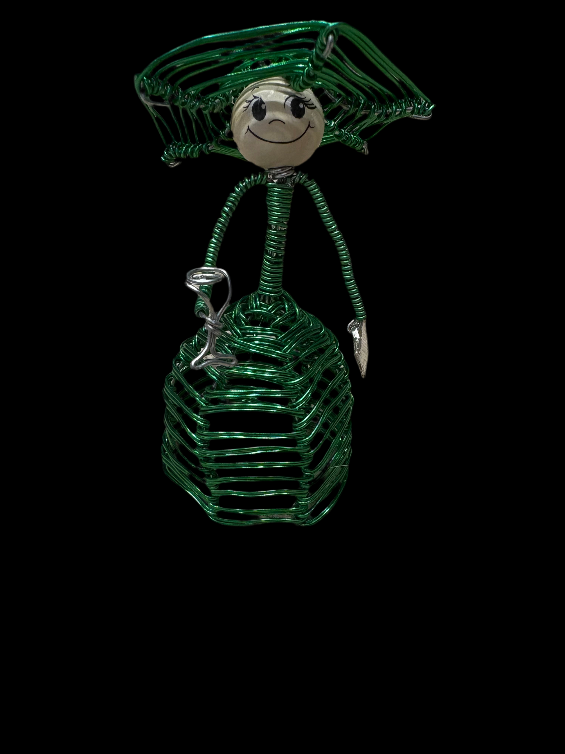 This exquisite handcrafted wire sculpture captures the timeless elegance of a Victorian-era lady, complete with delicate fan and stylish handbag. Each piece is meticulously hand-twisted and shaped using premium coloured aluminium wire, creating graceful flowing lines that embody feminine poise and sophistication. The vibrant coloured wire adds a contemporary twist to classic elegance, whilst the intricate details of the fan's delicate spokes and the handbag's curved handle the wine glasses fun showcase hours of patient artistry.